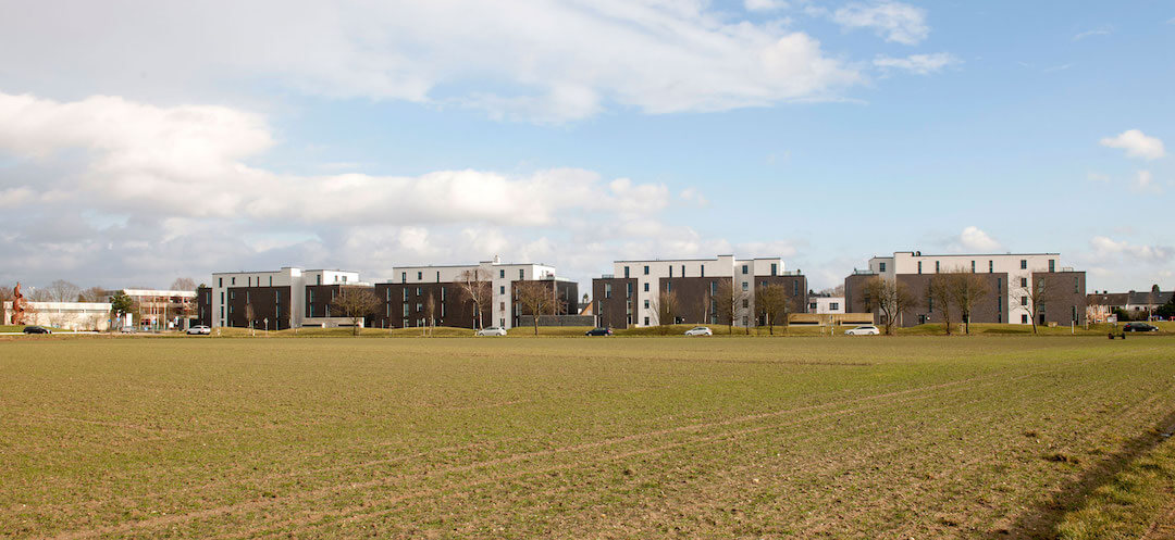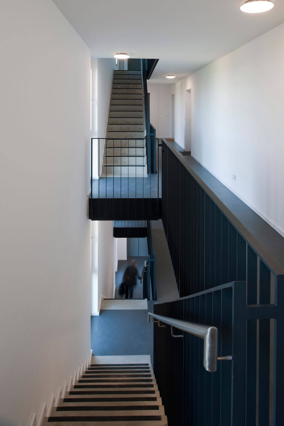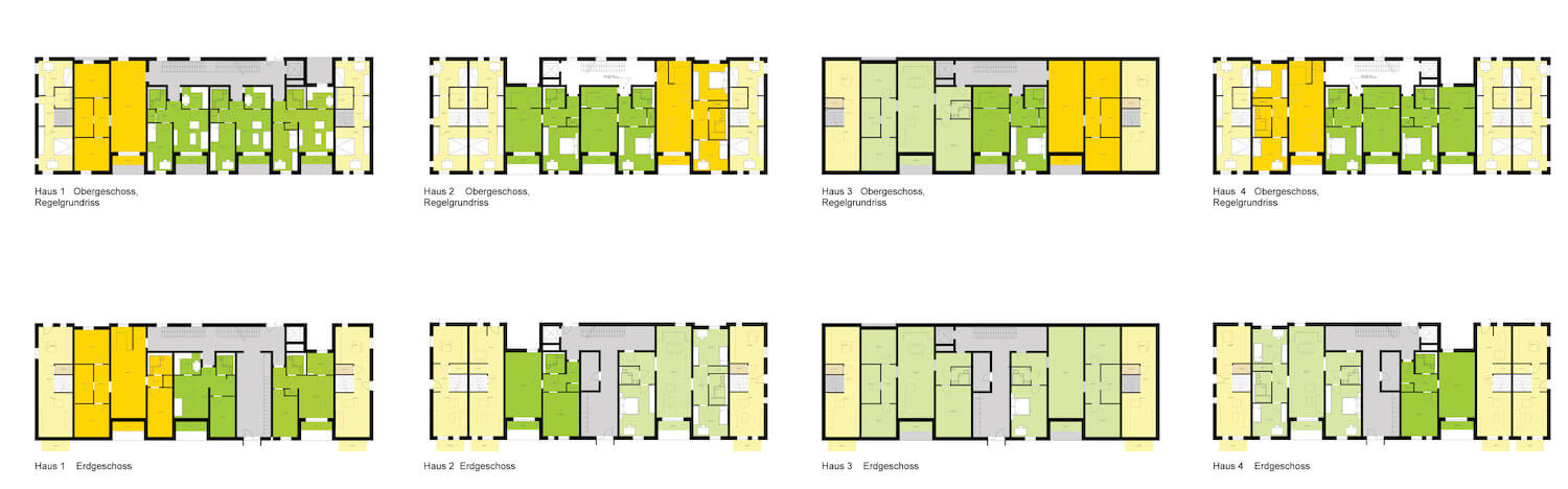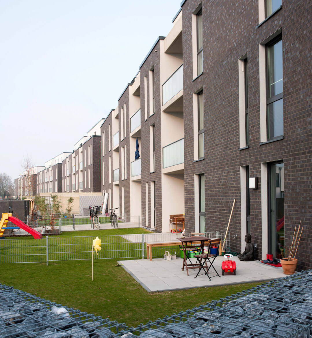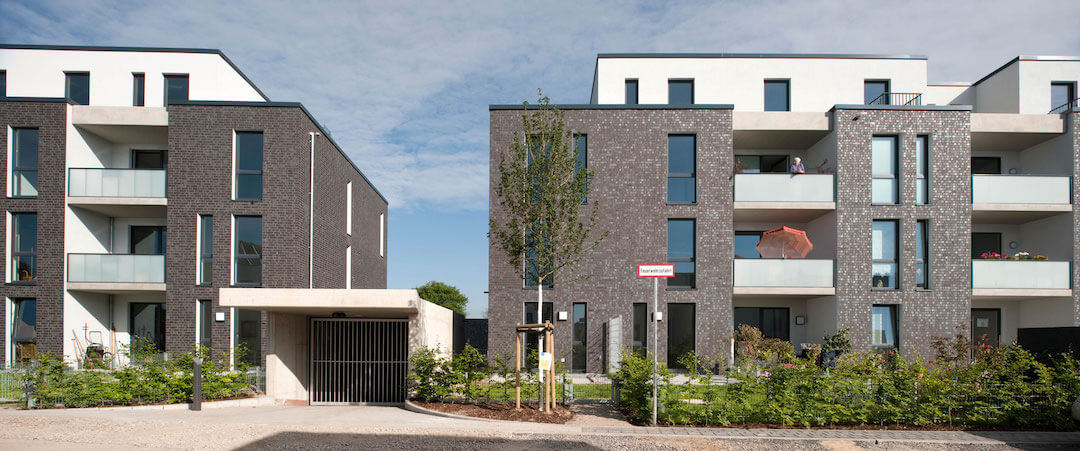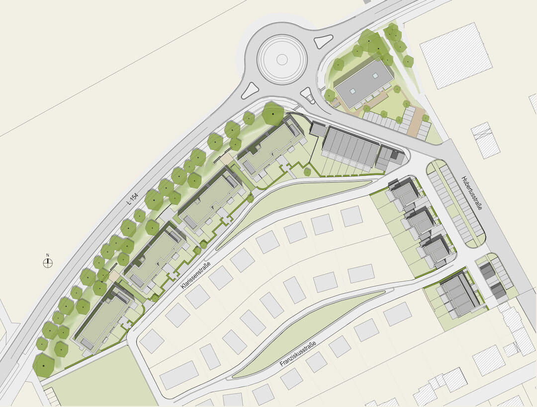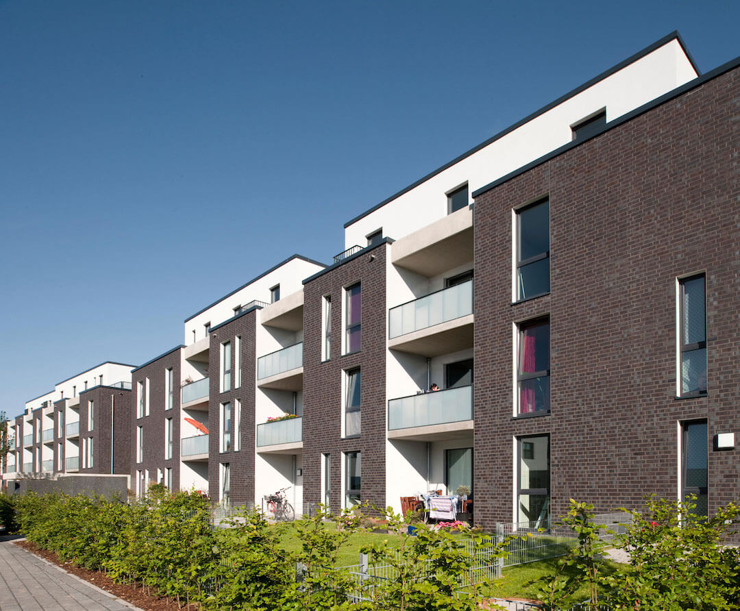 Bauherr GWG Neuss eG Wohnfläche ca. 4.607 m² Grundstücksfläche ca.6.271 m² Anzahl Wohneinheiten 53 Planung + Bau LP 1-9 Realisierungszeit 2011-2014 In der Klarissenstraße im Baugebiet Hubertusstraße werden insgesamt vier Mehrfamilienwohnhäuser mit 53 Mietwohneinheiten und zwei Tiefgaragen mit 69 Stellplätzen in der Klarissenstraße errichtet. Die Wohnungen sollen mit ihrer Mischung der Grundrisstypen und Größen sowohl den Bedürfnissen von Familien als auch älteren Menschen entsprechen. Auf der Nordseite befindet sich ein Außenraum mit gemeinsamen Aufenthaltsbereichen, welcher alle vier Mehrfamilienhäuser miteinander verbindet.
