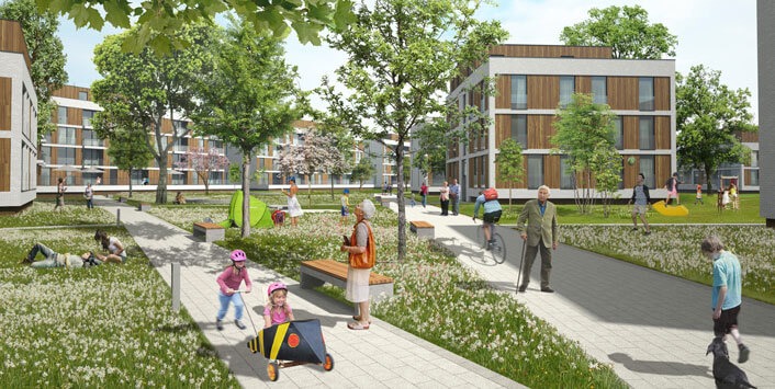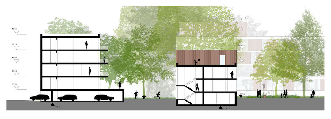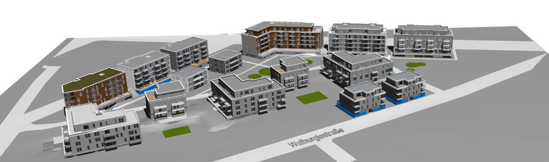 Bauherr DWG Wohnfläche ca. 17.546 m² Grundstücksfläche ca.21.000 m² Anzahl Wohneinheiten 194 Planung+Bau LPH 1-5 Die urbane Struktur der Bebauung rund um die Verweyenstraße ist gekennzeichnet von zusammenhängenden gebogenen Straßenräumen mit einem wiederkehrenden Muster aus geschlossenen und durchlässigen Rändern. Das Baufeld liegt an der Grenze zum landschaftlichen Raum nördlich der Schlossallee und ist mit seiner starken Durchgrünung ein gartenhafter Trittstein für den übergeordneten Landschafts- und Grünraumbezug im Quartier. Der „Garten“ ist das Leitbild dieser Planung. Seine grüne Mitte wird das prägende Motiv und durch die Qualifizierung auch tatsächlich zum nutzbaren Raum für alle Bewohner.Die bauliche Abschließung des neuen Quartiers und der damit verbundenen extrem großen Geräuschminderung nutzen wir als Vorteil für die zum Inneren des Blockes orientierten Wohngrundrisse. Die private Orientierung und Ruhe mit hoher Raumqualität stehen im Vordergrund. Die Gebäude gliedern sich durch ihre differenzierte Höhenstaffelung und unterschiedlichen Längen. Im Inneren sorgen Solitäre und Winkelgebäude für die maßstäbliche Kleinteiligkeit und differenzierte und klare Adressbildung der Gebäudegruppen.